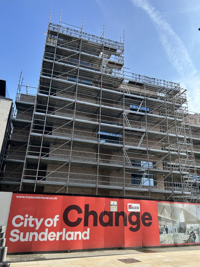 - + Scaffolding off two of the central area’s landmark buildings after careful restoration;